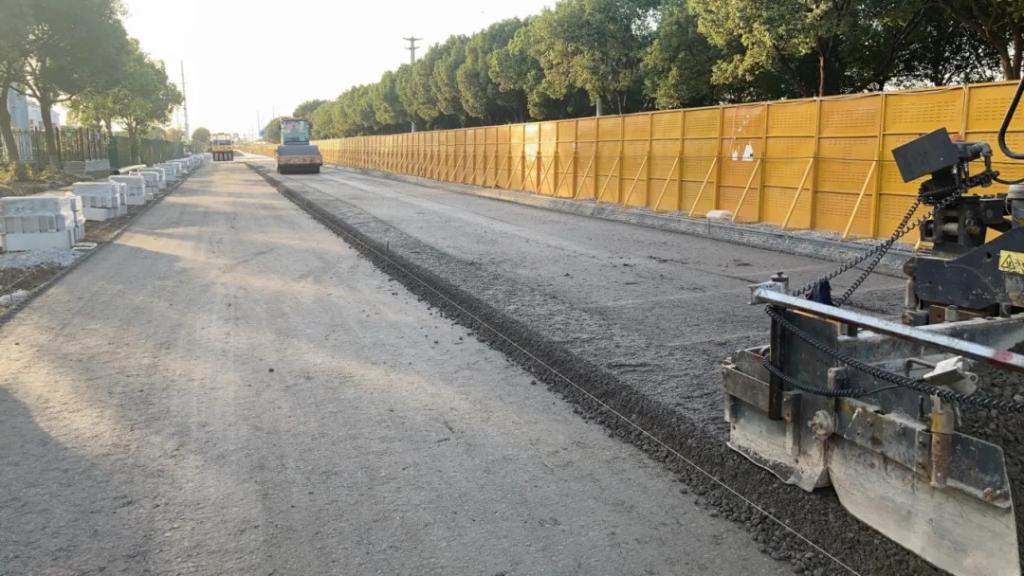 路面結構采用分層設計確保耐用性:主車道從下到上依次為30厘米厚的水泥穩(wěn)定碎石基層、6厘米厚的瀝青混凝土層和4厘米厚的抗滑瀝青層;破損路段額外增加80厘米厚的塊石混凝土基層進行加固;人行道和非機動車道則通過銑掉舊瀝青層,重新鋪設4厘米厚的抗滑瀝青,讓騎行和步行更平穩(wěn)舒適。
