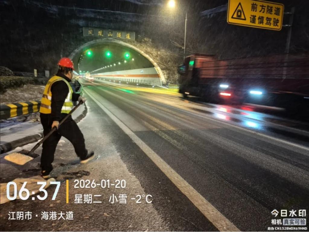 廣迅公司快速響應(yīng),同步聯(lián)動(dòng)公司多部門緊急支援,針對(duì)隧道出入口、橋梁銜接處等易結(jié)冰重點(diǎn)路段,撒布融雪劑,確保路面積雪全部清除;安排專人對(duì)隧道照明、監(jiān)控設(shè)備進(jìn)行巡查維護(hù),確保行車視線清晰、路況監(jiān)測實(shí)時(shí)可控,保障車輛行駛安全,累計(jì)投入人員21人次、各類機(jī)械8臺(tái)次,撒布融雪劑0.5噸。