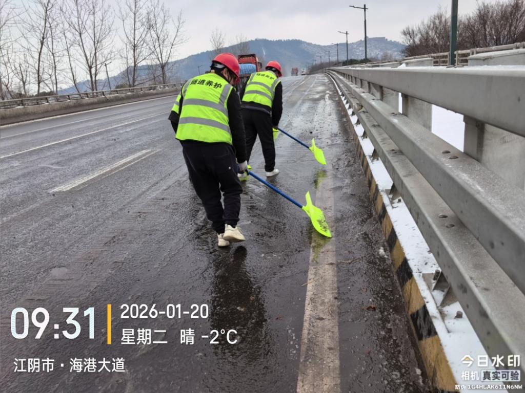 降雪發(fā)生后,暨陽公司迅速響應(yīng),各工區(qū)聞“雪”即動(dòng),第一時(shí)間啟動(dòng)《掃雪除冰應(yīng)急預(yù)案》,組織一線職工晝夜奮戰(zhàn),保障群眾出行安全與道路暢通。公司對(duì)所管養(yǎng)的國省干線、重點(diǎn)路段及橋梁開展拉網(wǎng)式巡查,對(duì)易積雪結(jié)冰路段提前設(shè)置警示標(biāo)志,做足防凍、除雪、保暢處置。全體應(yīng)急隊(duì)伍保持24小時(shí)通訊暢通,隨時(shí)待命。值班人員嚴(yán)密監(jiān)控天氣變化與路網(wǎng)運(yùn)行實(shí)時(shí)狀況,保證各類突發(fā)情況與險(xiǎn)情能夠第一時(shí)間發(fā)現(xiàn)、第一時(shí)間上報(bào)、第一時(shí)間得到有效處置。
