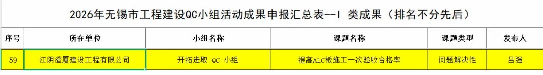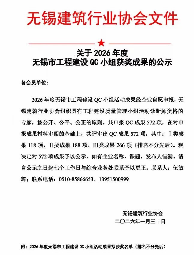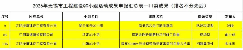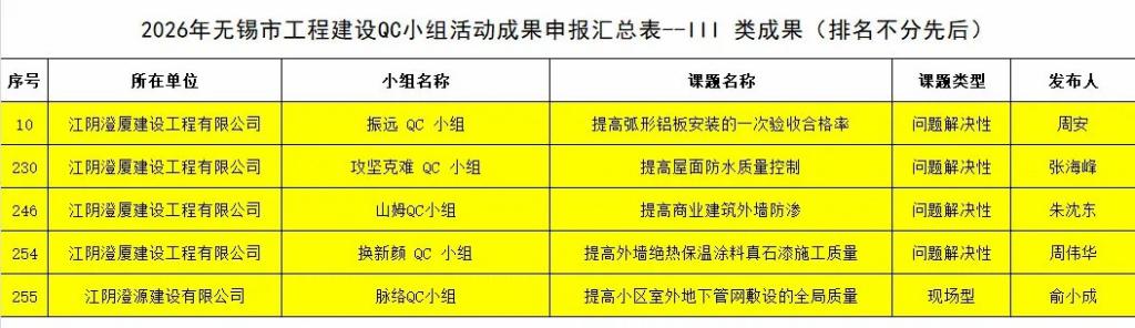 近日,2026 年度無錫市工程建設(shè) QC 小組活動(dòng)成果評(píng)選落幕,澄廈澄源公司喜獲 1項(xiàng)Ⅰ類成果獎(jiǎng),3 項(xiàng) Ⅱ 類成果獎(jiǎng)、5 項(xiàng) Ⅲ 類成果獎(jiǎng),共計(jì) 9項(xiàng)殊榮,在質(zhì)量管理領(lǐng)域持續(xù)突破。
