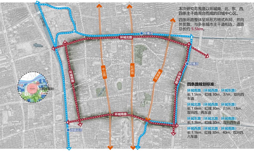 為黨的二十大重要決策部署和“十四五”規(guī)劃重大工程項(xiàng)目,城市更新已經(jīng)成為江陰城市 發(fā)展的重要引擎。圍繞“拆建改提”總要求,全面優(yōu)化城市更新專項(xiàng)規(guī)劃和行動(dòng)方案,以外部形 態(tài)織補(bǔ)、內(nèi)部功能重構(gòu)為著力點(diǎn),注重“文化傳承”與“功能升級(jí)”,從老舊小區(qū)煥新、道路拓 寬優(yōu)化、智慧交通打造、城市家具美化、建筑立面提升、背街小巷藝術(shù)文化營(yíng)造、綠化景觀升級(jí)、 夜景照明亮化等方面對(duì)城市核心商圈進(jìn)行有機(jī)更新,讓街道風(fēng)貌與周邊業(yè)態(tài)相契合,提升人居環(huán) 境、激發(fā)老城文化活力,提高人們的獲得感和幸福感。 作為城市的“血管”,道路是城市風(fēng)貌、特色與活力的展示窗口。伴隨著城市體量的不斷擴(kuò)容和功能板塊的調(diào)整,環(huán)城四路等主城區(qū)道路存在交 通擁堵、建筑立面老舊、綠化景觀不佳等問(wèn)題。讓歷史街區(qū)煥新容,解決城市更新痛點(diǎn),環(huán)城四路品質(zhì)提升工 程將以外部形態(tài)織補(bǔ)、內(nèi)部功能重構(gòu)為著力點(diǎn),深挖舊城記憶,注入“文化編織”。 環(huán)城東路承載著江陰人集體記憶的環(huán)城東路,道路建設(shè)在江陰老城墻基礎(chǔ) 之上,毗鄰千年護(hù)城河——東城河,如何因地制宜傳承城市文脈、構(gòu) 建特色街巷是該道路的煥新重點(diǎn)。8 個(gè)景觀節(jié)點(diǎn)和 2 條文化小巷,串珠成鏈,形成濱河景觀帶,沿東城河重點(diǎn)搭建上下兩層親水公共平臺(tái), 豎立標(biāo)志性景觀節(jié)點(diǎn),提升夜景形象。拾級(jí)而下,主題公園、星空景墻, 特色景亭,濱水吧臺(tái),人們漫步其中,賞四季美景,品歲月變遷。 環(huán)城南路,南門(mén)核心商圈是目前江陰最炙手可熱的打卡新地標(biāo),不斷增大的 人車(chē)流量造成了交通堵塞,影響著人們的出行便利。針對(duì)這一現(xiàn)狀, 重點(diǎn)進(jìn)行道路拓寬改造,實(shí)現(xiàn)雙向四車(chē)道,增設(shè)非機(jī)動(dòng)車(chē)道,打通交 叉口瓶頸,全面提升通行能力。為了凸顯南門(mén)核心商圈和諧統(tǒng)一的時(shí) 尚氛圍,沿路建筑立面改造以濱江藍(lán)、高級(jí)灰、古典咖、活力橙作為 主色調(diào),結(jié)合朝宗門(mén)、老街巷等城市文脈,打造主題廣場(chǎng)、主題游園、 主題展廳和文化小巷,讓忠義之邦在歷史與現(xiàn)代交融中蝶變煥新。 環(huán)城西路是沿錫澄運(yùn)河景觀帶的交通干線,隨著沿路商鋪匯聚、 居民樓密集和學(xué)校路段早晚高峰,導(dǎo)致該道路擁堵無(wú)序,無(wú)法展現(xiàn)城 市景觀風(fēng)貌。改造后的環(huán)城西路,從杏春橋到人民橋路段整體西拓 20 米,設(shè)計(jì)雙向六車(chē)道,道路中央設(shè)花箱隔離欄,西移杏春加油站,提 升道路渠化結(jié)構(gòu);同時(shí)整條道路以展現(xiàn)江陰地方文化、民間文藝為設(shè) 計(jì)主線進(jìn)行立面出新和功能升級(jí),打造“江上勝跡,人文薈萃”的城 市街區(qū)。 環(huán)城北路緊鄰東橫河,沿路遍布商業(yè)體、老小區(qū)和醫(yī)院,交通擁堵、 景觀缺失。整條道路改造提升充分利用沿河空間北拓,清除障礙物, 確保雙向四車(chē)道,設(shè)置人行空間,打造親水景觀步道,塑造慢行交通 環(huán)境。通過(guò)增添城市家具、口袋公園等配套設(shè)施,讓人們?cè)诜泵Φ亩?市生活中,領(lǐng)略老北門(mén)地域特色,觀密林流水,享漁港風(fēng)情。
